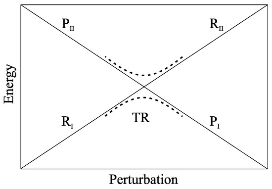 Schematic description of the diabatic (solid lines) and adiabatic (dashed lines) energy surfaces within the energy vs. perturbation plane.
