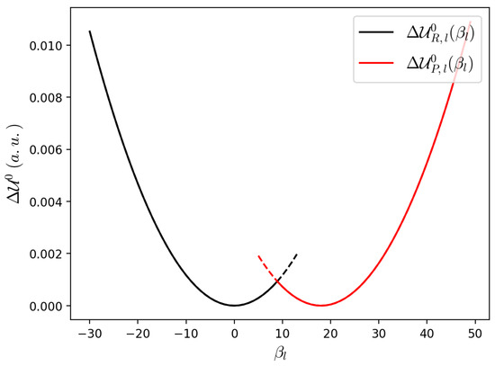 R and P unperturbed harmonic energies. After the intersection is represented as a black dashed line and before the intersection is represented as a red dashed line.