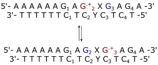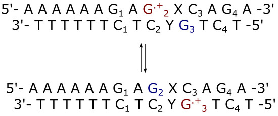Schematic representation of interstrand charge transfer in double strands where the bridge is and is the complementary strand of . The electron donor is (in blue) and the acceptor is (in red). These two Guanine bases belong to different strands.