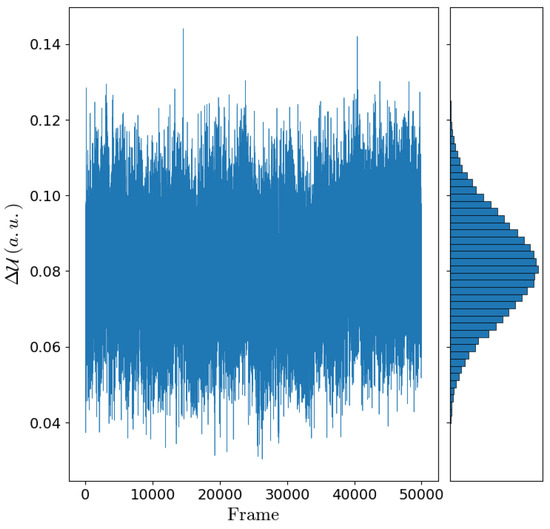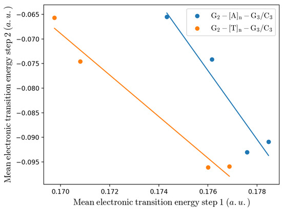 According to the reaction scheme I (Equation (32)), the electronic transition energies for each DNA molecule were estimated by means of the MD-PMM procedure (see the Theory section). Note that the use of the other, within our approximations, equivalent reaction scheme (reaction scheme II Equation (33)) provided almost identical electronic transition energies and (within the noise) the same results, thus showing the reliability of the approximations employed. In Figure 5, the electronic transition energies and its Gaussian behavior is reported for the ds-5-d(AAAAAAGAGTGAGA)-3 as an example.