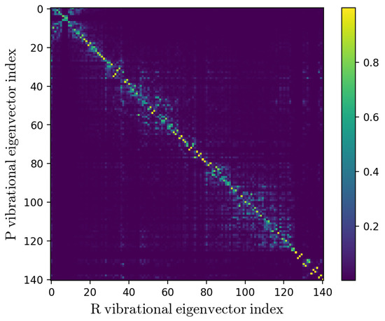 Squared elements of the Duschinsky matrix for the R and P vibrational eigenvectors (i.e., the R and P mass-weighted Hessian eigenvectors).