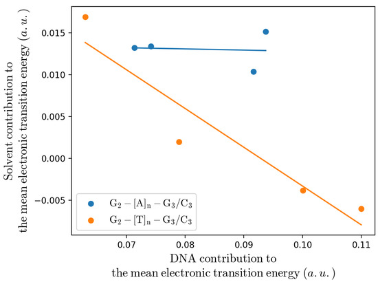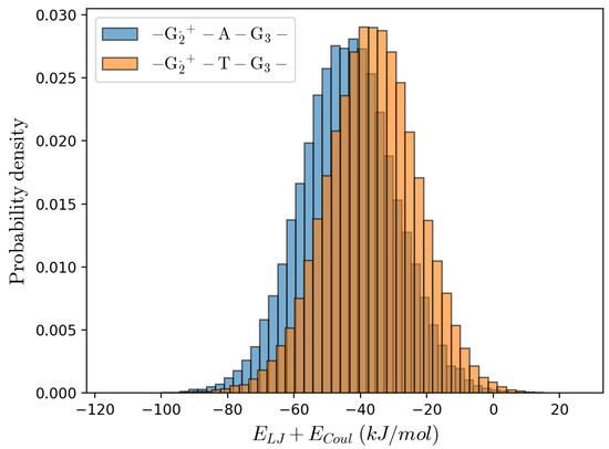 Remarkably, from Table 2 it is evident that our estimate of the (intra-strand) rate constant (i.e., ) for the T-type bridge systems well matches the experimental value for all the sequences, irrespective of the bridge length, while for the A-type bridge systems our calculations always underestimate the rate constant and, in particular, for the single Adenine bridge case a large discrepancy is present. Interestingly, when dissecting the mean electronic transition energy into the solvent and DNA contributions (i.e., as obtained considering either only the solvent or only the DNA perturbation), it emerges that for the intra-strand CT the main difference between the A-type and T-type bridge systems is the solvent contribution being much larger in the A-type bridge systems (in the T-type bridge systems an almost null solvent contribution is present, see Supplementary Materials, thus indicating an almost identical solvent average perturbation for and ) with a clear negative correlation only for the T-type bridge systems (for the A-type bridge systems the solvent contribution seems basically independent of the DNA one, see Figure 7). Such results suggest a possible MD force field inaccuracy for treating the interaction between the solvent and ––, providing a too high solvent contribution to the mean transition energy: e.g., the lack of a proper stacking term between the oxidized Guanine and the Adenine bases could provide an excessive solvent- interaction in the R ensemble, over-stabilizing as suggested by the comparison of the solvent- interaction energy distributions as obtained by the MD simulations of the –– and –– sequence containing substrates (see Figure 8). Note that in order to test other force fields, we performed the same calculations using the BSC1 [51] force field or the TIP3P [52] water model finding (within the noise) identical results, see Supplementary Materials.