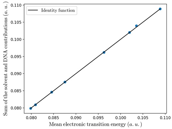 Comparison between the mean electronic transition energy and the sum of the solvent and DNA contributions. The solid line is the bisector of the plane.