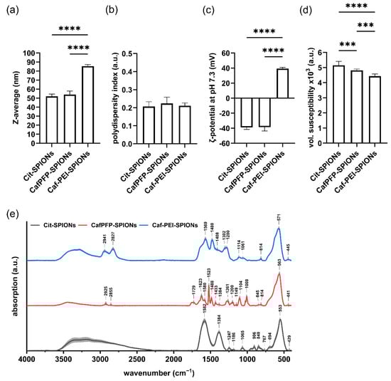 To verify the magnetic properties of the synthesized SPIONs, the magnetic susceptibility was investigated by using a magnetic susceptibility meter (MS2G, Bartington Instruments, Witney, UK). The SPION dispersions were diluted with H2O (Cit-SPIONs and Caf-PEI-SPIONs) or with EtOH (CafPFP-SPIONs) to an iron concentration of 1 mg/mL for the measurement.