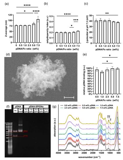 After complexation with various weight ratios of pDNA/Fe, Caf-PEI-SPION parameters were found to be unchanged until 2.5 wt% pDNA, while binding almost all added pDNA to their surface. Adding larger amounts of pDNA (up to 7.5 wt%) to the SPIONs still resulted in high binding efficiencies. Xiao et al. even reported pDNA binding of > 90% for pDNA/SPION weight ratios of 8/1 [
