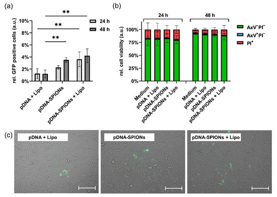 32]. Similarly, Kamau et al. reported transfection efficiencies in 293T cells of 14% without and up to 73% with magnetic attraction when incubating cells with 5 µg of pDNA bound to SPIONs [