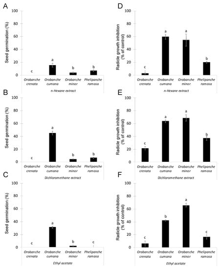 Allelopathic effects on suicidal germination (A–C) and radicle growth (D–F) of 4 broomrape species: Orobanche crenata, Orobanche cumana, Orobanche minor and Phelipanche ramosa induced by extracts prepared from sequential extractions with n-hexane (A,D), dichloromethane (B,E), and ethyl acetate (C,F) of Conyza bonariensis shoots in each figure, bars with different letters are significantly different according to the Tukey test (p < 0.05). Error bars represent the standard error of the mean.
