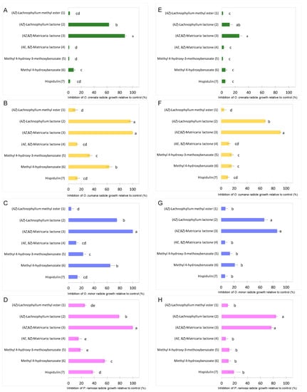Growth inhibition induced by (4Z)-lachnophyllum methyl ester (1); (4Z)-lachnophyllum lactone (2); (4Z,8Z)-matricaria lactone (3), (4E,8Z)-matricaria lactone (4); methyl 4-hydroxy-3-methoxybenzoate (5); methyl 4-hydroxybenzoate (6); hispidulin (7); applied at 1mM (A–D); and 0.1mM (E–H); in radicles of O. crenata (A,E); O. cumana (B,F); O. minor (C,G); and P. ramosa (D,H); bars with different letters are significantly different according to the Tukey test (p < 0.05). Error bars represent the standard error of the mean.