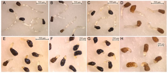 Treatments with control (A–D) and compound (4Z,8Z)-matricaria lactone (3) applied at 0.1mM (E–H) on radicles of O. crenata (A,E); radicles of O. cumana (B,F); radicles of O. minor (C,G); and radicles of P. ramosa (D,H).