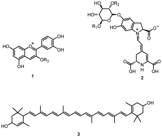 Natural colors in fruits and plants are essential for photosynthesis, pollination, and seed dissemination [1,2]. Colors in plants are caused by three chemically distinct pigment types, anthocyanins (1), betalains (2), and carotenoids (3) (Figure 1). Anthocyanins are water-soluble pigments that give blue, red, and purple hues. The chemistry, production, and distribution of these compounds have been extensively investigated in the past [3,4,5,6,7].