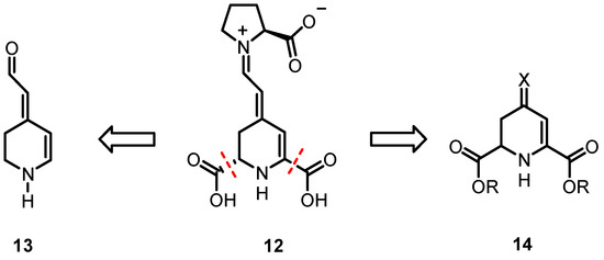 To investigate relationships between the chemical structure and biological properties of indicaxanthin derivatives in further detail, analogs 13 of 12 that lack the two carboxy moieties in positions C-2- and C-6 were considered first. Herein, we describe the design and synthesis of betalamic acid analog 13 that is devoid of carboxy groups in positions C-2 and C-6. Additionally, experiments were conducted to synthesize the betalamic acid derivative 14 in a simpler and more cost-effective manner and to evaluate its reactivity toward oxygen (Scheme 3).
