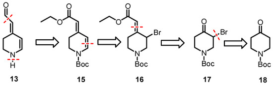 We planned to synthesize 13 from the α,β-unsaturated ester 15 that bears a Boc-protective group at the piperidine ring. At first, the ester must be reduced to afford an aldehyde and finally, the Boc-protective group must be removed. The α,β-unsaturated ester 15 can be obtained by a Wittig reaction of α-bromoketone 17 and the subsequent β-elimination of 16. The α-bromoketone should be available by α-bromination of an appropriate piperidone derivative, e.g., 18.