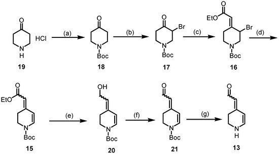 Synthesis of the key intermediate 13. Reagents and reaction conditions were as follows: (a) Boc2O, NaHCO3, THF/H2O, r.t., 16 h 96%. (b) Br2, AlCl3, THF/Et2O, 0 °C, 16 h, 46%. (c) Ph3P=CHCO2Et, CH2Cl2, 40 °C, 2 h, 95%. (d) Li2CO3, LiBr, DMF, 75 °C, 3 h, 88%. (e) DIBAL-H, toluene, −78 °C, 1 h, 94% or LiAlH4, THF, −10 °C, 1 h, 70%, (f) TEMPO, CuCl, DMF, r.t, 16 h, 90%. (g) H2O/dioxane, 90 °C, 2 h, 5%.