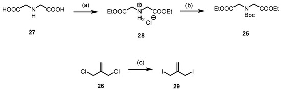 For the synthesis of methylenepiperidine 24, the diester 25 and the diiodide 29 were prepared (Scheme 7). The diester HCl salt 28 was obtained by esterification of iminodiacetic acid (27) with SOCl2 in refluxing ethanol. The secondary amine of 27 was protected with Boc2O to afford the carbamate 25 in a 76% yield. The diester 25 was initially treated with dichloride 26, which, however, did not lead to the desired 4-methylenepiperidine 24. To obtain the desired methylenepiperidine 24, the more reactive diiodide 29 should be employed instead of the dichloride 26. Allyl diiodide 29 was freshly prepared by a Finkelstein reaction of commercially available 3-chloro-2-(chloromethyl)prop-1-ene (26) with NaI in acetone [44]. After a reaction time of 16 h in refluxing acetone, the diiodide 29 was obtained in a 99% yield.