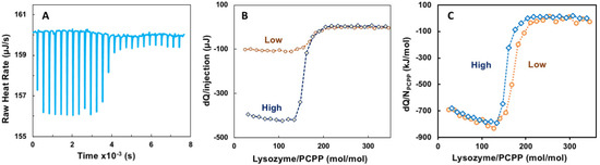 ITC data for the binding of lysozyme onto PCPP (direct titration). (A) raw data, (B) incremental heat per injection and (C) ITC isotherm for two different concentrations of reactants (0.125 (A–C) and 0.5 mg/mL (B,C) PCPP solutions were titrated with 2.5 and 10 mg/mL solutions of lysozyme, correspondingly. Concentrations are shown in Figures as “High” (blue, diamonds, dotted line) and “Low” (brown, spheres, pointed line); PBS, pH 7.4).