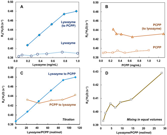 Self-assembly of lysozyme and PCPP was also explored using noninvasive analytical technique—water proton NMR (wNMR). Unlike conventional analytical NMR approaches, wNMR monitors the signal of H2O protons, and its transverse relaxation rate R2(1H2O) mediated by water-solute interactions could serve as a probe of solute physico-chemical status/structural organization. Due to overwhelmingly higher water concentration compared to lysozyme and PCPP, R2(1H2O) could be easily measured using low-field benchtop time-domain NMR instruments. To ensure that the observed changes indeed characterize the formation of complexes, R2(1H2O) dependence on the concentration of protein and polymer alone were first studied (Figure 2A,B, dotted and dashed lines, correspondingly). As seen from Figures, the results demonstrated the absence or very shallow effects of individual components on water proton transverse relaxation rates in the explored concentration range. In contrast, titration of PCPP with lysozyme showed a rapid increase in R2(1H2O) in the same concentration range (Figure 2A solid blue line). Contrary to this, changes observed when reverse titration was conducted were minimal (Figure 2B solid brown line). Of note, under the reverse titration conditions PCPP is added at rather high concentration (10 mg/mL), and quite probably is already clustered, thus, the increase in lysozyme to PCPP ratio has almost no effect on the R2(1H2O) value (Figure 2B,C, solid brown line). Figure 2C shows the results plotted as a function of molar protein-to-polymer ratios. The study was also performed when both components were mixed at equal volumes. In this case, the changes in water proton transverse relaxation rate were similar to those observed for the titration of polymer with the protein (Figure 2D).