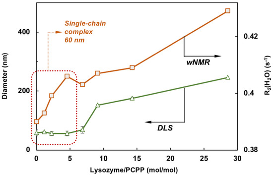 Comparison of wNMR and DLS data shows that contrary to DLS, wNMR is capable of detecting self-assembly processes at low lysozyme loadings (the zone for complexes formed with a single PCPP chain is designated by dotted line, z-average diameters are shown, mixing in equal volumes).