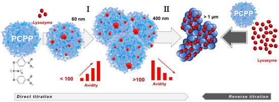 The compendium of ITC, wNMR, and DLS data characterizes interactions between lysozyme and PCPP as a formation of submicron (60–400 nm) and micron sized (1 µm and higher) complexes with multiple protein molecules assembled onto a single polymer chain (Figure 5). All methods suggest that the transition to micron size aggregates take place when the excess of bound protein exceeds one hundred protein copies per polymer chain (Figure 3A,B). wNMR data also suggest that in the submicron size range the complex is first formed as a single polymer chain assembly (z-average hydrodynamic diameter is around 60 nm). As the protein load increases, those complexes assemble into multichain clusters, which retain their size (approximately 400 nm in diameter) in a relatively broad (30–90) protein-to-polymer molar ratio range (Figure 3A). ITC results clearly demonstrate that the ability of micron size complexes containing more than one hundred protein molecules per polymer chain to bind more lysozyme is rapidly decreasing (Figure 1C and Figure 3B). One might suggest that the increased binding of the positively charged protein decreases overall negative charge of the polymer, thus, lowering its protein binding propensity and facilitating the self-assembly to larger micron-sized complexes. It needs to be noted that ITC results also show some increase in the avidity of lysozyme to submicron complexes as the protein loading in them raises (region I in Figure 3B). A similar positive cooperativity effect was reported for interactions between low molecular weight PCPP and lysozyme in solutions with low ionic strength [44]. However, although still detectable, this effect for the high molecular weight polymer of the present study for formulations prepared at near physiological conditions appears to be not nearly that pronounced.