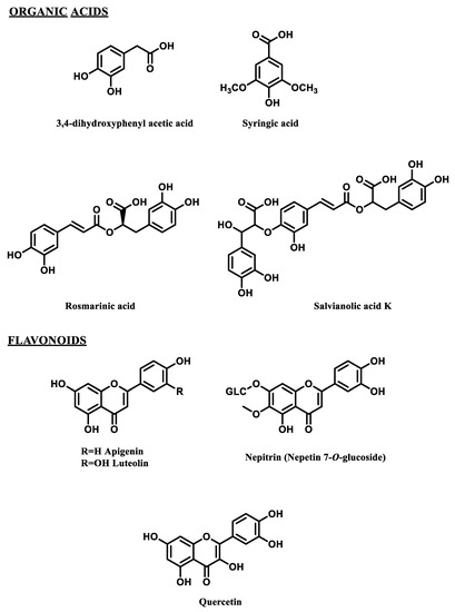 As previously stated for the group of organic acids, in each species, flavonoids were also present with 5–6 different compounds, the first of which was dominant on all the other flavonoids detected. In four out of five species, this predominant flavonoid was luteolin 7 O-glucuronide, the only flavonoid detected in all species. It was the most abundant flavonoid in S. officinalis (28.49 mg g−1, 16.0% of the total compounds), T. vulgaris (26.24 mg g−1, 16.3%), O. majorana (26.07 mg g−1, 20.0%) and O. vulgare (8.97 mg g−1, 7.2%). Lower amounts were found in R. officinalis (3.28 mg g−1, 2.4% of the total identified compounds), where otherwise significant amounts were detected of luteolin 3 O-glucuronide (15.64 mg g−1, 11.6%), which took the place of the “dominant” flavonoid. Luteolin derivative (6.55 mg g−1) was retrieved only in O. vulgare, where four derivatives of apigenin were found as well (apigenin derivative A, apigenin derivative B, apigenin 7 O-glucoside and methyl apigenin O-glucuronide). Nepitrin was detected only in S. officinalis (10.12 mg g−1), and an apigenin glucuronide (10.51 mg g−1) in O. majorana.