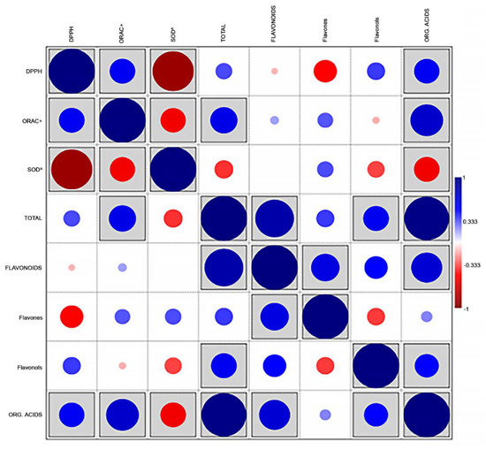 This measurement is also directly correlated to the flavonoid content (r = 0.834, p < 0.001) and, to a lesser, although significant, extent, to the flavonols content (r = 0.551, p = 0.033). The sum of flavonoids was, expectedly, correlated with their major components, i.e., flavones (r = 0.609, p = 0.016), but also to the amounts of organic acids (r = 0.666, p = 0.007). Significant associations were detected between the content in organic acids and all measurements of antioxidant activity (r = 0.705, significant at p = 0.003; r = 0.543, significant at p = 0.036; r = −0.548, significant at p = 0.034, with ORAC, DPPH and SOD values, respectively). DPPH and ORAC (expressed as TE μmol/mg dm) were positively associated with each other (r = 0.549, p = 0.034), whereas the values of SOD (expressed as SC50 mg dm/mL) followed an opposite trend, being inversely correlated with DPPH and ORAC (r = −0.889, p < 0.001, and r = −0.541, p = 0.037, respectively). Unexpectedly, the flavones content showed a significant inverse correlation with DPPH measurements (r = −0.497, p = 0.006).