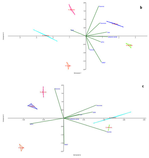 The first PC is more associated with the content of organic acids and the total content of active metabolites, whereas the content of flavones, and to a lesser extent, flavonoids, are well-explained by PC2. PC3 is otherwise linked to the content in flavonols.