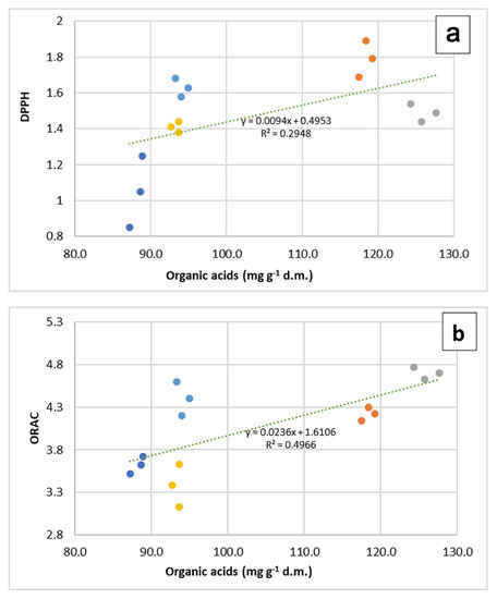 In all three representations, whatever their position, the vectors representing the values of DPPH and ED50 always take opposite directions. The regression plots between all three measurements of antioxidant capacity and the total content of organic acid in samples (Figure 4a–c) show how the seemingly good fitting of pooled data, as seen by means of correlation analysis, is however markedly different according to the species. The observation of graphs allows partitioning the five species into two groups, composed by O. vulgare, O. majorana and R. officinalis, dealing with low amounts of organic acids, and S. officinalis and T. vulgaris, characterized by higher amounts of these compounds.
