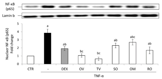 Nuclear NF-κB (p65). The Caco-2 monolayer was pretreated with the extracts for 24 h, and subsequently exposed to 50 ng/mL of TNF-α for 6 h. Cultures treated with the vehicles alone were used as controls (CTR). Dexamethasone (DEX), 10 µM for 1 h, was used as a positive control. Caco-2 nuclear lysates were analyzed by Western blotting, and nuclear localization of the p65 protein was evaluated. NF-κB (p65) intensity values were normalized to the corresponding Lamin-B value. Results are reported as fold change against control and expressed as mean ± SD of three independent experiments. a p < 0.05 vs. CTR; b p < 0.05 vs. TNF-α; c p < 0.05 vs. DEX + TNF-α. OV: Origanum vulgare L.; RO: Rosmarinus officinalis L.; SO: Salvia officinalis L.; OM: Origanum majorana L.; TV: Thymus vulgaris L.
