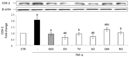 COX-2 protein expression. The Caco-2 monolayer was pretreated with the extracts (50 µg/mL) for 24 h, and subsequently exposed to 50 ng/mL of TNF-α for 6 h. Dexamethasone (DEX), 10 µM for 1 h, was used as a positive control. Cultures treated with the vehicles alone were used as controls (CTR). Caco-2 whole cell lysates were analyzed by Western blotting, and the expression of the COX-2 protein was evaluated. Results are reported as fold change against control and expressed as mean ± SD of three independent experiments. COX-2 intensity values were normalized to the corresponding b-actin value. a p < 0.05 vs. CTR; b p < 0.05 vs. TNF-α; c p < 0.05 vs. DEX + TNF-α. OV: Origanum vulgare L.; RO: Rosmarinus officinalis L.; SO: Salvia officinalis L.; OM: Origanum majorana L.; TV: Thymus vulgaris L.