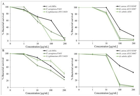 The Gram-negative strains Escherichia coli DH5α, Pseudomonas aeruginosa PAOI and Salmonella tiphymurium ATCC14028 and Gram-positive strains Staphylococcus aureus ATCC6538P, Bacillus subtilis AZ59 and Bacillus cereus ATCC10987 were used to evaluate antimicrobial activity. These strains were grown in LB medium, under agitation at 37 °C.
