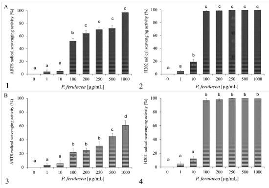 Antioxidant activity of P. ferulacea flower oil (A) and leaf oil (B). ABTS radical scavenging activity (1, 3) was measured after 10 min of incubation and reported as % of ABTS removed, with respect to the control. Hydrogen peroxide scavenging activity (2, 4) was measured after 30 min of incubation and reported as % of H2O2 removed, with respect to the control. Data were presented as mean and standard error and they were analyzed with a paired t-test. Bars not accompanied by the same letter were significantly different at p < 0.05.