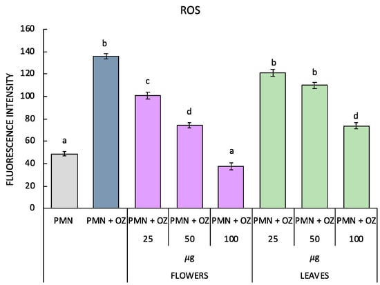 As for the activity of antioxidant enzymes in PMNs treated with essential oils extracted from flowers, they show the same trend. In fact, as can be observed from Figure 4, the activity of CAT SOD and GST statistically increases as the concentration of flower essential oil increases. As for the essential oil of leaves, the activity of SOD and CAT increases in the PMNs treated with 50 and 100 µg compared to the PMNs stimulated with OZ, which were not treated with essential oils. With regard to the activity of GST, it increases in PMNs treated with 50 µg of leaf essential oil compared to PMN that is stimulated with OZ but not treated with essential oils.