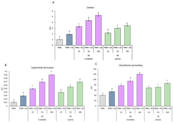 Activities of antioxidant enzymes: catalase (A); superoxide dismutase (B) and glutathione peroxidase (C) in polymorphonuclear cells treated with essential oils of P. ferulacea at the concentrations of 0, 25, 50, 100 µg/mL with or without OZ (0.5 mg mL−1). Data were presented as mean and standard error and they were analyzed with a paired t-test. Bars not accompanied by the same letter were significantly different at p < 0.05.