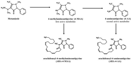 Using liquid chromatography–mass spectrometry (LC–MS), two additional metabolites, arachidonoyl-4-methylaminoantipyrine (ARA-4-MAA) and arachidonoyl-4-aminoantipyrine (ARA-4-AA), were identified to be present following oral metamizole administration, in recent research. Further metabolism of 4-MAA and 4-AA results in the production of active arachidonoyl amides, whose presence in the mouse spinal cord and brain has been established (Figure 2). The idea that these metabolites are produced in the central nervous system (CNS) is supported by the fact that fatty acid amide hydrolase (FAAH), an enzyme that is found in high concentrations in the brain, is involved in the formation of arachidonoyl amides [32,33].