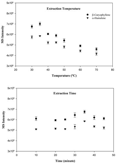The primary goal of the present study was to develop and validate a HS-SPME method coupled with GC/Q-ToF-MS in order to quantitate the in vitro metabolism of β-caryophyllene by both human liver microsome (HLM) and S9 liver fractions. Within this study, we report both the optimization and validation of the developed HS-SPME technique and its application in the analysis of metabolites present in samples containing either HLM or S9 biological matrices.
