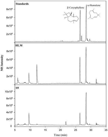 Human liver microsomes and S9 fractions (pooled mixed sex) were procured from In Vitro Technologies Inc. (Melbourne, Australia). G-6-PDH, glucose-6-phosphate, NADP+, and UDPGA were procured from Sigma Chemical Company (St. Louis, MO, USA). In addition, β-caryophyllene and α-humulene were also procured from Sigma Chem. Co., with the purity of both compounds being confirmed by chromatographic analysis to be ≥95%. All other chemicals were procured from Fisher Scientific (Pittsburgh, PA, USA). Headspace vials (20 mL) were purchased from Agilent Technologies (Santa Clara, CA, USA). Polydimethylsiloxane (PDMS) (100 µm × 23 Ga), carboxen/PDMS (85 µm × 23 Ga), and PDMS/divinylbenzene (65 µm × 23 Ga) SPME fibers were procured from Supelco (Bellefonte, PA, USA).