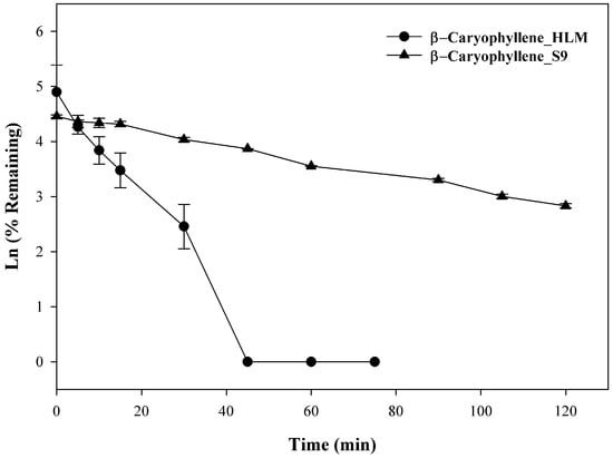 Time-dependent metabolic depletion of β-caryophyllene in pooled human liver microsome and human S9 fractions. Human liver microsomes and human S9 fractions were incubated with β-caryophyllene (10 µM) for 0–75 min and 0–120 min in presence of cofactors, respectively. The data are expressed as mean ± SEM (n = 3).