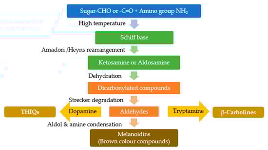 The Maillard reaction [] known as the major “cooking reaction”, is a succession of non-enzymatic glycation thermal reactions that provide the basis for the browning colors and aromas characteristic of cooked foods, e.g., grilled meat, roasted coffee, fried onions, or toasted bread. There is a major interest in this reaction for food processing, pharmacology, toxicology, and life sciences [,]. The final stage in this reaction includes the aldol condensation of the aldehydes, these reactions are catalyzed by amines to give aldols and N-free polymers, and complex aldehyde-amine polycondensations. The condensation might be with amines such as tryptamine or dopamine, followed by an eventual Pictet-Spengler type reaction, leading to the formation of various β-carbolines (βCAs) and Tetrahydroisoquinolines (THIQs) heterocycles (Figure 1). The end products of Maillard reaction (MRPs) or its intermediary antinutritive compounds are suspected of toxicological effects in animal models, and have been implicated in diseases, notably in neurodegenerative disorders [,]. Their quantity in cooked meats varies according to meat type and cooking practices, i.e., temperature, duration, the presence of water, and the concentration of sugar and amino acids, while their identity depends on the reacted sugars and amino acids []. For that, factors derived from diet, precisely overcooked meats, and the identification of Maillard reaction products (MRPs) drawn our attention for their possible implication in ET. Even though the Maillard reaction has been widely studied, many of its products are not fully characterized and their biological effects need more investigation.