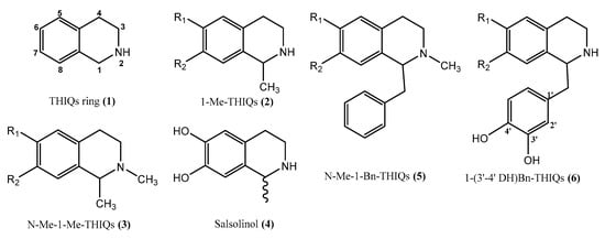 Tetrahydroisoquinolines (THIQs) are widely distributed among plants, foods, and in the environment; some of them are present in the mammalian brain and, since 1980, they are considered as endogenous compounds. The exogenous compounds have the ability to cross the blood–brain barrier (BBB) []. The THIQ family contains different subgroups based on the eventual additional rings connected to the basic structure (Figure 2). The administration of THIQs to a wide range of animal models (primates and mice) was found to reduce the tyrosine hydroxylase (TH) activity, the enzyme responsible for converting tyrosine to dopamine, and dopamine levels in the brain [], knowing that this reduction implicated in different nervous system diseases. However, not all THIQs have toxic effects, some THIQs in fact increase the levels of glutathione (GSH), nitric oxide (NO), and S -nitrosothiols, with a positive impact on the redox capacities, consequently affording a protection against oxidative stress []. So, while some THIQs are potent neurotoxins, such as tetrahydropapaveroline THP (1-[(3,4-dihydroxyphenyl)methyl]-1,2,3,4-tetrahydroisoquinoline-6,7-diol) and 1-benzyl-1,2,3,4-tetrahydroisoquinoline (1BnTHIQ), others, such as higenamine (1-[(4-hydroxyphenyl)methyl]-1,2,3,4-tetrahydroisoquinoline-6,7-diol) and 1-methyl-1,2,3,4-tetrahydroisoquinoline (1-MeTHIQ), are neuroprotectants and have neurorestorative actions [].