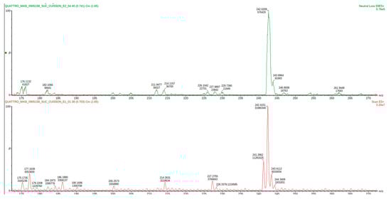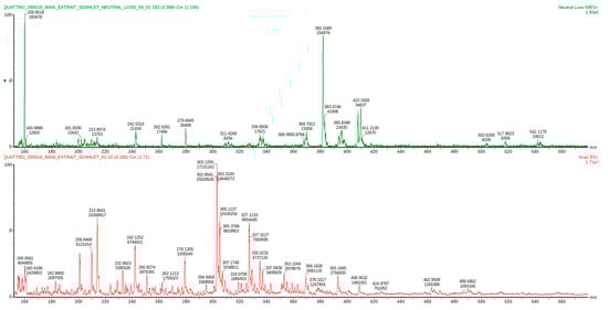 The Micromass Quattro Premier (Waters), driven by the MassLynx 4.0 software, was used in direct injection with the following settings: capillary voltage, 3.1 kV, 80 °C; cone voltage, 20 V, 120 °C; extractor voltage, 4V; analysis flow, 10 µL/min. ESI spectrum were recorded in positive mode, applying full scan, daughter scan, and neutral loss.