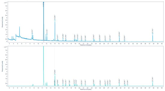 Total ion chromatogram (TIC) for the aqueous chicken sample extracted by SAFE and derivatized with PFBHA (up) and the extracted-ion chromatogram (EIC) 180.7–181.7 m/z (down) (* indicates that the peak has been manually integrated).