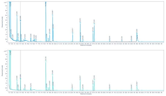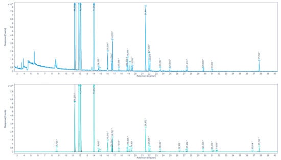 A reference table of retention times (RT), Kovats retention indices (KRI) and mass spectra was built, in our GC-MS condition, based on SAFE extract realized on “Aldehydes mixtures-556”. In total ion chromatograms (TIC), the peaks corresponding to these reference standards were identified by their RT and KRI, according to EPA method 556, their C6F5 CH2 fragment (characterized through an extracted-ion chromatogram (EIC) m/z 180.7–181.7), and a mass spectrum match in the NIST 2017 database. Carbonyl analytes were tentatively identified by the same characteristics, comparing the RTs, KRIs, and fragmentations of reference peaks with those in the chromatograms of the SAFE distillates obtained from aqueous extracts of browned chicken meat juice (Figure 5, Table 3), and overcooked chicken meat (Figure 6, Table 4) a blank injection allowed to identify eventual procedural oximes as recommended by EPA method 556. For any sample peak RT that was not corresponding to a reference peak, the MS spectrum was searched through the NIST database.