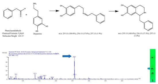 Expected reaction between dopamine and phenylacetaldehyde. Mass spectrum obtained for the 2nd spot of the reaction mixture on MS grade TLC plate.