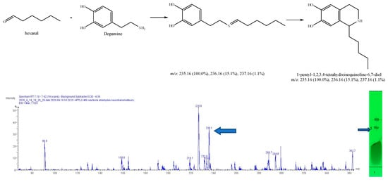 Expected reaction between dopamine and hexanal. Mass spectrum for the 1st spot of the reaction mixture on MS grade TLC plate.