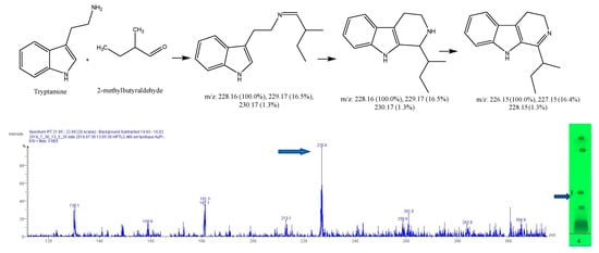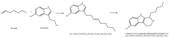 The method to identify such an “artifactual” formation of β-carboline alkaloids or isoquinoline was deduced from Bunel, et al. []. It is based on direct contact in equimolar concentrations between the aldehydes identified in the meat extracts and neurotransmitter for 16 h at 37 °C, in aqueous medium; when the aldehyde or neurotransmitter was not soluble in water, methanol was our second choice, whereas, to solubilize tryptophan, an alkaline medium was used.