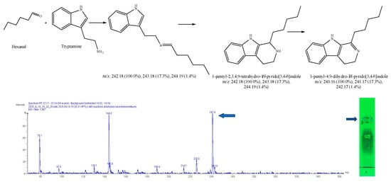 Expected reaction between serotonin and hexanal. Mass spectrum for the spot of the reaction mixture on MS grade TLC plate.
