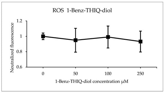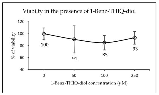 Viability after 24 h exposure to different concentrations of 1-Benz-THIQ-diol, data from four biologically independent experiments performed with three technical replicates (resazurin viability test; mean ± SD) (N = 12). There is no significant difference between concentrations (ANOVA; p = 0.150).