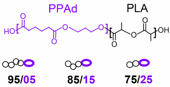 The materials investigated here are diblock copolymers based on PLA and PPAd, synthesized in a previous work by Terzopoulou et al. [30]. Briefly, the copolymers were prepared by using an initial PPAd polymer of low Mn ~ 6 kg/mol, forming the first block, onto which the second block of PLA was build, in situ, via ring opening polymerization of L-lactide at 180 °C (Figure 1). The samples differ in the mass ratio PLA (%)/PPAd (%) as 95/5, 85/15 and 75/25 and are listed in Table 1 along with values on the estimated average molar masses (Mn). As reference samples, we comparatively study the initial PPAd (the same as that used in the copolymer preparation) and a neat PLA prepared by a similar ROP route (Table 1). Regarding the initial scope of these copolymers, this was a success as the enzymatic degradation of PLA is significantly accelerated in the copolymers as compared to PLA in bulk.