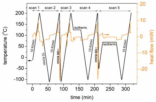 (Left axis, black line) The time–temperature profiles for Scans 1–5 of the DSC measurements. (Right axis, orange line) A representative example of the recorded heat flow against time is shown.