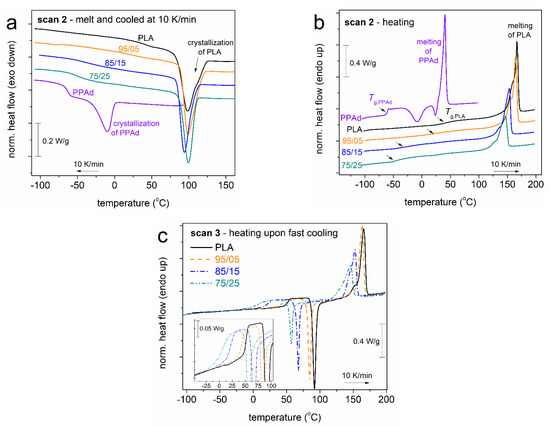 In Figure 5, we follow the effects of the PPAd loading and of each thermal treatment on CF. CF = 0 upon the fast cooling, which denotes that the cooling rate of ~100 K/min (in the temperature range of the expected crystallization) is sufficient to eliminate crystallization [21,23]. However, this rate is not sufficient to prevent nucleation, which is also expected for conventional cooling in PLA [23]. For Scans 3–5, in Figure 5a, CF drops monotonically by ~10% with the addition of PPAd. The same happens with the characteristic Ts of crystallization (melt and cold) in Figure 5b, which drops by about 10–40 K (depending on the thermal treatment). The results suggest that both the amounts as well as the rates of crystallization (nucleation/lamellae packings) are slower/hindered in the copolymers. The retarded lamellae packing should have an impact on the quality (density and/or size) of the spherulites. This is partly confirmed by the lowering of the melting temperature, Tm, with PPAd loading (see Figure 3b,c and Figure 4b,d). The situation seems to be more complex for the case of Scan 2 (non-isothermal crystallization), within which both the CF and Tc do not seem to vary significantly. In our previous work [26] on the same systems, we presented PLM results for the crystallization during the cooling of Scan 2 which showed non-systematic effects on the rate of crystallization (faster for PLA and 85/15 and slower for 95/05 and 75/25) while the final size of the spherulites was found to increase in the copolymers. Additionally, compared to most scans, the isothermal cold-crystallization has resulted in both lower CF and Tc. This is most probably due to poor mobility of the chains during crystallization, which is reflected in the doubled (on average) crystallization times needed (Figure 4c), compared to the case of melt-crystallization.
