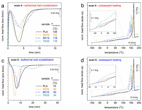 In Figure 4a,c, we present the time evolutions of crystallization, while in Figure 4b,d, we show the subsequent heating scans. Almost all systems, including neat PLA, exhibit similar crystallization rates. The exception to this behaviour is the cold-crystallization of 75/25, which is somewhat retarded. The effects are actually due to the different Tanneal selected for the different samples, thus, the result on the crystallization rate should not be compared between the different samples for drawing conclusions on the direct effect of the copolymeric structure on the nucleation and crystal growth (e.g., the performance of Avrami analysis [52]). For the most clear conclusions, the results of Figure 4 (Scans 4 and 5) have been evaluated and are discussed in terms of crystalline fraction (CF, Equation (1)) and the overall results (Scans 2–5) in terms of characteristic temperatures, namely, crystallization, Tc, onset of crystallization, Tc,onset, cold-crystallization, Tcc, onset of cold-crystallization, Tc,onset, and glass transition temperature. Please note that the Tg is always estimated from the corresponding heating scan.